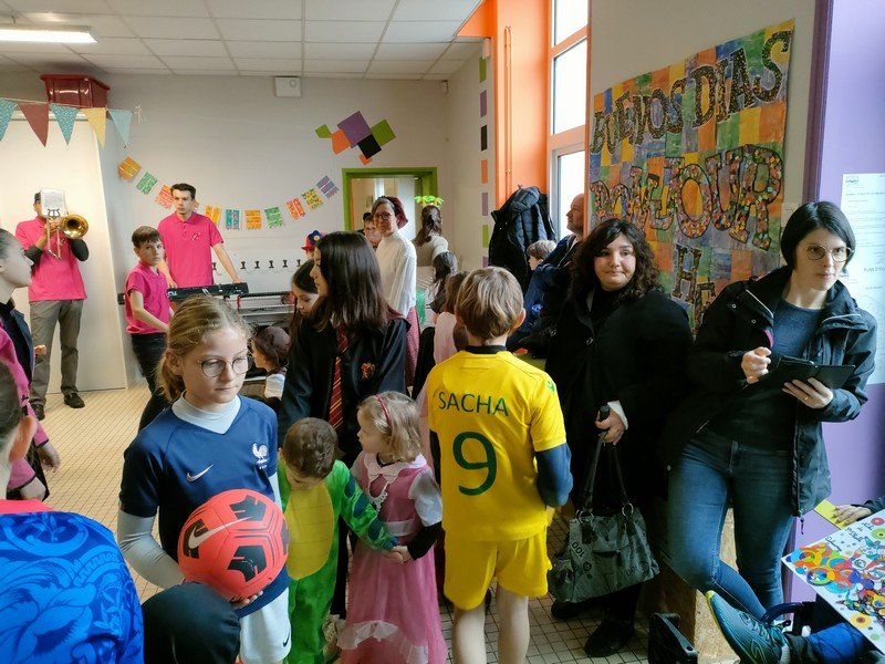 Mais le soleil était quand même au rendez-vous dans la joie et les sourires des enfants : déguisés, ils ont fait une grande farandole dans les classes, accompagnés par la fanfare Nouvel’Air de St Denis-Boulogne.