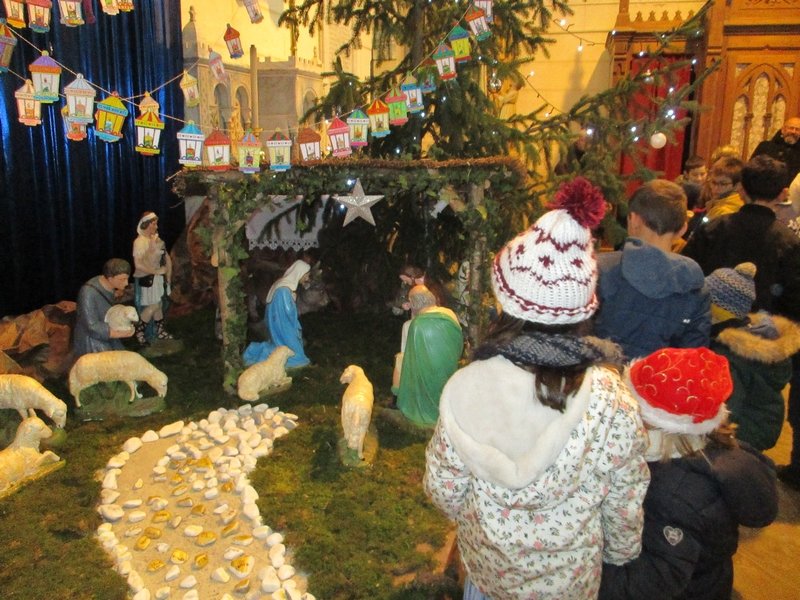 Notre célébration était centrée cette année sur l’attente de la naissance de Jésus et comment nous pouvons agir sur notre comportement, nos émotions pour nous préparer à Noël. Chaque classe a apporté une guirlande de lanternes pour symboliser l’Avent et chaque enfant a déposé un galet pour tracer le chemin allant à la crèche.