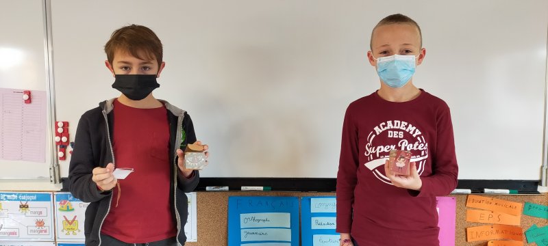Avec Rosleyne, en arts visuels, ils ont confectionné plusieurs bricolages de Noël qu’ils ont enveloppés dans des boites avec du papier journal ou du tissu afin de continuer ce mois spécial “déchets”.