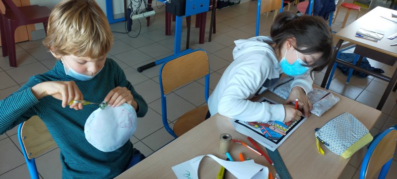 Avec Rosleyne, en arts visuels, ils ont confectionné plusieurs bricolages de Noël qu’ils ont enveloppés dans des boites avec du papier journal ou du tissu afin de continuer ce mois spécial “déchets”.
