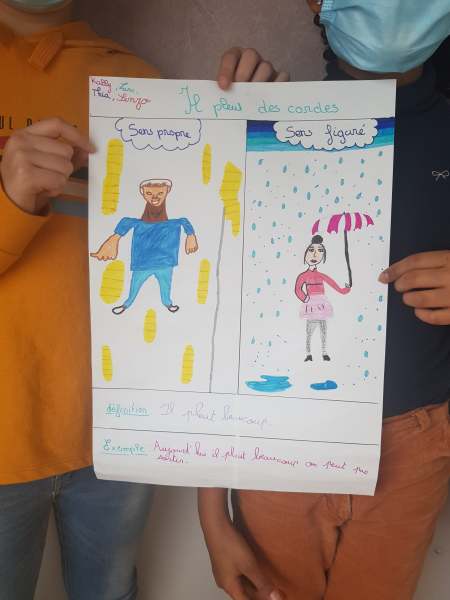 Pour clore notre séquence de lexique sur le sens propre et le sens figuré, les CM2 ont préparé des affiches avec des expressions françaises illustrées. Ils ont travaillé par groupe de 4 ou de 5 et ont cherché comment illustrer une expression, la définir puis l’employer dans une phrase exemple.