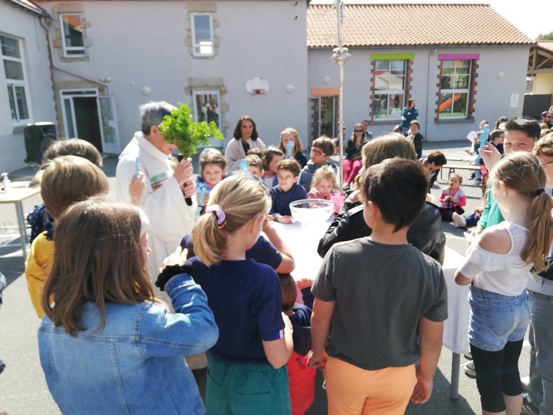 Ensuite, nous nous sommes retrouvés, élèves, parents et invités, sur la cour, pour le temps de bénédiction célébré par notre curé, l’abbé Jean-Baptiste Vy. Les élèves ont chanté, prié et chaque classe a reçu une croix bénie par notre abbé.