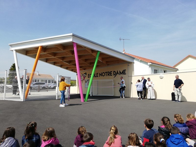 Puis est venu le temps des discours, nécessaire et intéressant, permettant de retracer les grandes étapes de notre projet et surtout de remercier tous nos partenaires, la Direction de l’Enseignement Catholique (DEC) représentée par Mr Franck Graveleau (adjoint de notre directeur diocésain Mr Christophe Geffard, et en charge du 1er degré en Vendée), Mme la Maire Mireille Hermouet et tous les donateurs de notre action de mécénat pour l’aménagement de notre cour.