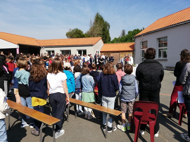 Puis est venu le temps des discours, nécessaire et intéressant, permettant de retracer les grandes étapes de notre projet et surtout de remercier tous nos partenaires, la Direction de l’Enseignement Catholique (DEC) représentée par Mr Franck Graveleau (adjoint de notre directeur diocésain Mr Christophe Geffard, et en charge du 1er degré en Vendée), Mme la Maire Mireille Hermouet et tous les donateurs de notre action de mécénat pour l’aménagement de notre cour.
