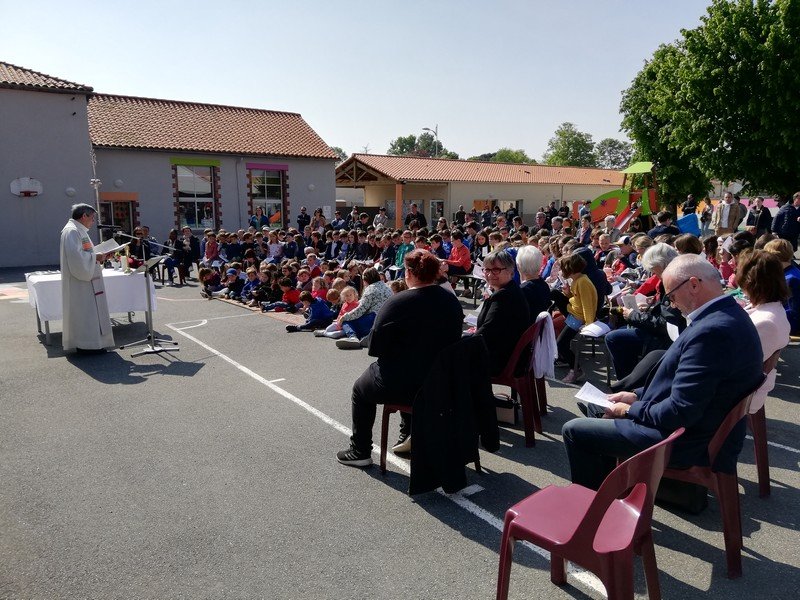 Ensuite, nous nous sommes retrouvés, élèves, parents et invités, sur la cour, pour le temps de bénédiction célébré par notre curé, l’abbé Jean-Baptiste Vy. Les élèves ont chanté, prié et chaque classe a reçu une croix bénie par notre abbé.