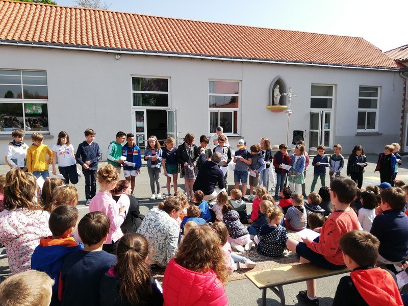 Ensuite, nous nous sommes retrouvés, élèves, parents et invités, sur la cour, pour le temps de bénédiction célébré par notre curé, l’abbé Jean-Baptiste Vy. Les élèves ont chanté, prié et chaque classe a reçu une croix bénie par notre abbé.