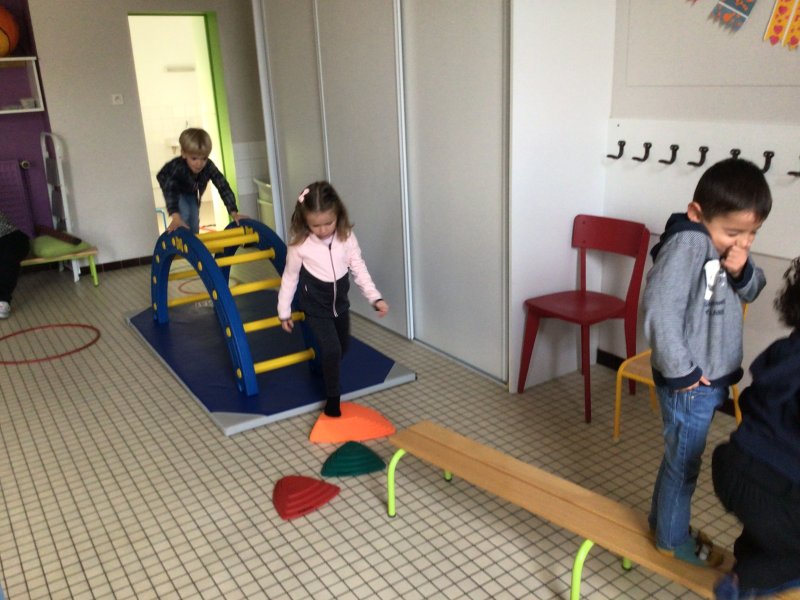 Septembre et octobre : réalisation de parcours athlétiques sur la cour ou en salle pour bouger notre corps : sauter, grimper, glisser, marcher en équilibre, rouler, courir, ramper… et déplacements avec les véhicules de la cour : karts et trottinettes… le lundi.