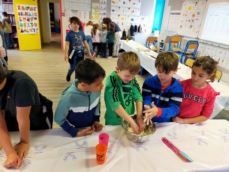 Le lendemain 7 avril, tous les élèves de l’école se sont retrouvés sur la cour de l’école pour une “mini” célébration sur le thème du partage. Les élèves qui avaient fabriqué un pain l’ont partagé et  donné la moitié de leur pain aux élèves de maternelle et aux adultes présents.