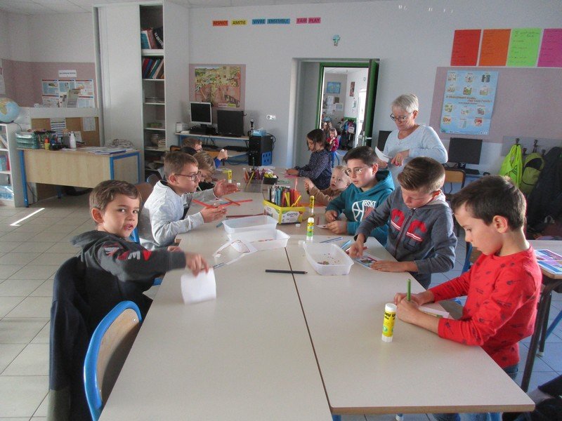 • Atelier arts visuels avec Lapinou le petit lapin : les enfants ont réalisé une petite carte individuelle avec un décor de théâtre et leur mot préféré. Ces cartes figureront bientôt sur notre panneau d’affichage sous le petit préau.