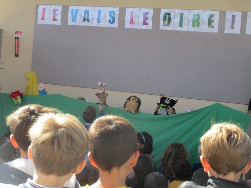 En fin de matinée, nous nous sommes tous retrouvés sur la cour et les marionnettes ont joué une saynète permettant de découvrir notre thème : JE VAIS LE DIRE !!!